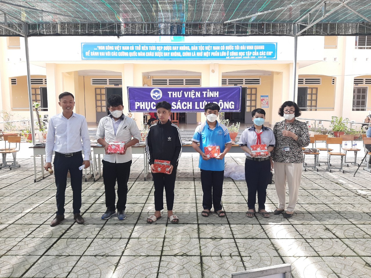 Ban tổ chức trao quà cho các em học sinh tham gia trả lời câu hỏi tại chương trình phục vụ sách lưu động.