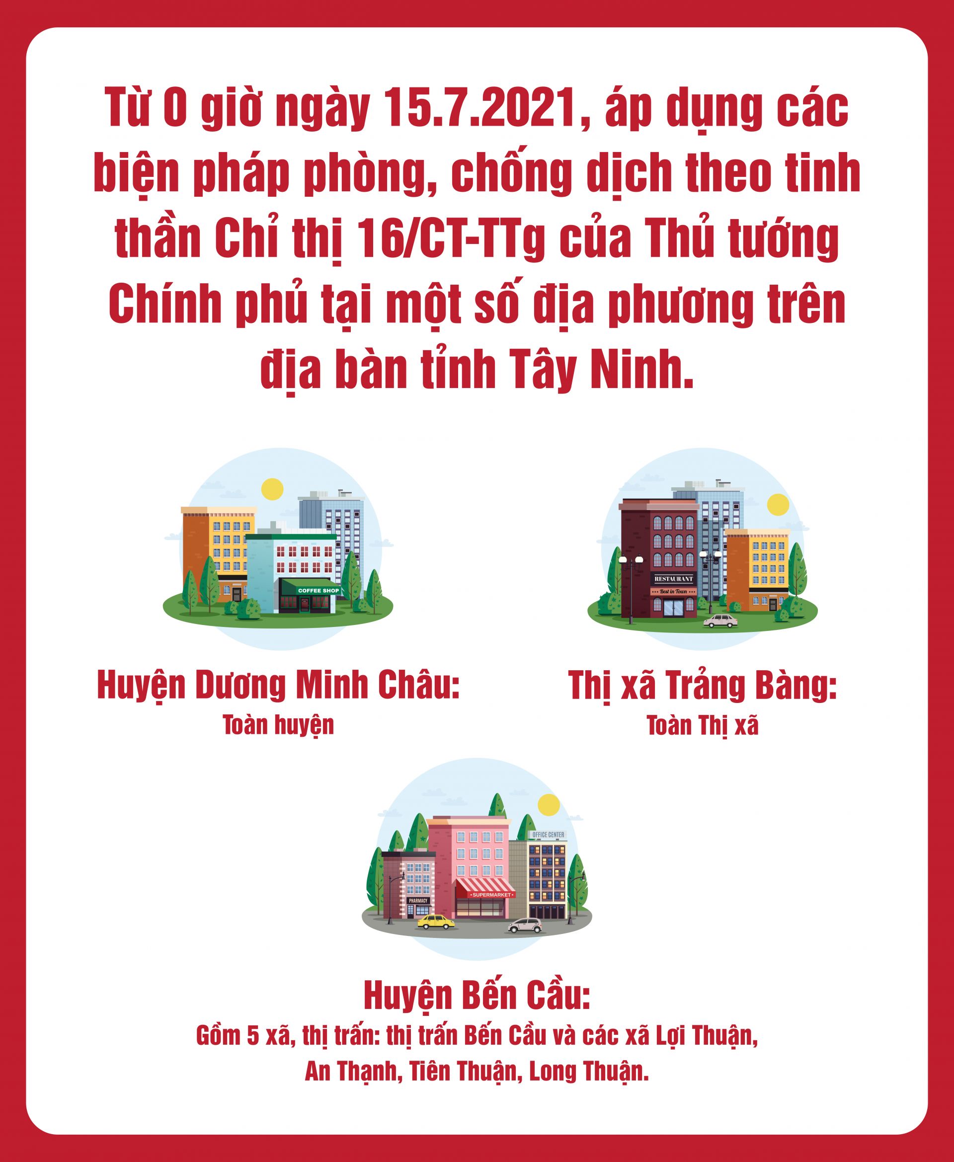 Trong những ngày qua, trước tình hình dịch bệnh Covid-19 diễn biến phức tạp. Từ 0 giờ ngày 15.7, thực hiện giãn cách xã hội theo Chỉ thị số 16/CT-TTg của Thủ tướng Chính phủ tại một số địa phương trên địa bàn tỉnh Tây Ninh. Cụ thể như sau: