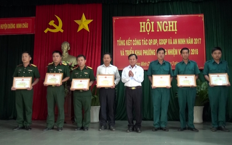Nhân dịp này, UBND huyện Dương Minh Châu đã khen thưởng cho 4 tập thể và 10 cá nhân có thành tích xuất sắc trong công tác quân sự, quốc phòng ở địa phương trong năm 2017.