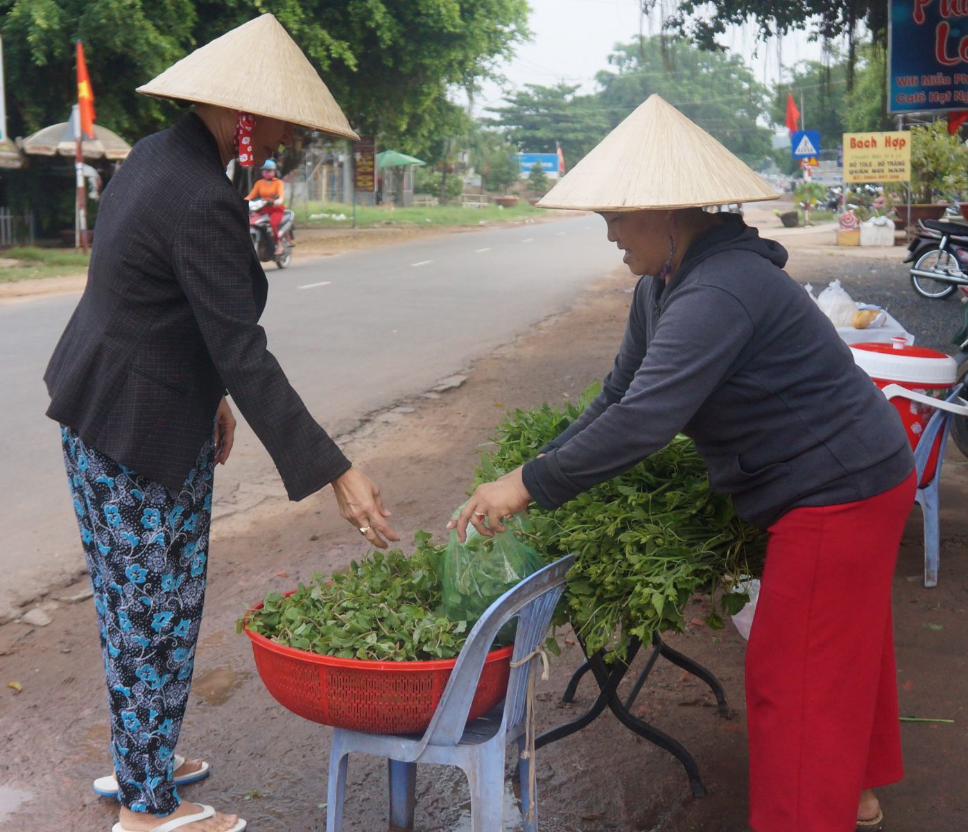Người tiêu dùng mua rau tại quầy rau “cây nhà lá vườn” của bà Hậu.