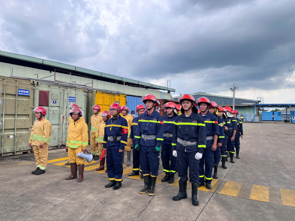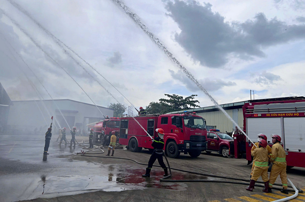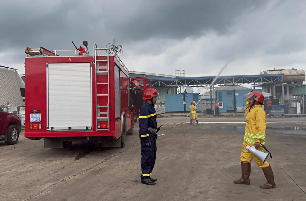Tình huống giả định xảy ra cháy tại khu vực lò sấy nhà xưởng A thuộc Công ty TNHH Điều Intersnack. Lực lượng PCCC cơ sở phát hiện cháy và báo động, triển khai các hoạt động chữa cháy ban đầu. Tuy nhiên, phương tiện chữa cháy và trang bị bảo hộ cá nhân còn hạn chế, khói khí độc đã bao trùm toàn bộ diện tích nhà xưởng nên lực lượng PCCC cơ sở không thể tiếp cận gần đến vị trí mặt lửa để triển khai chữa cháy, dẫn đến đám cháy tiếp tục phát triển nhanh.