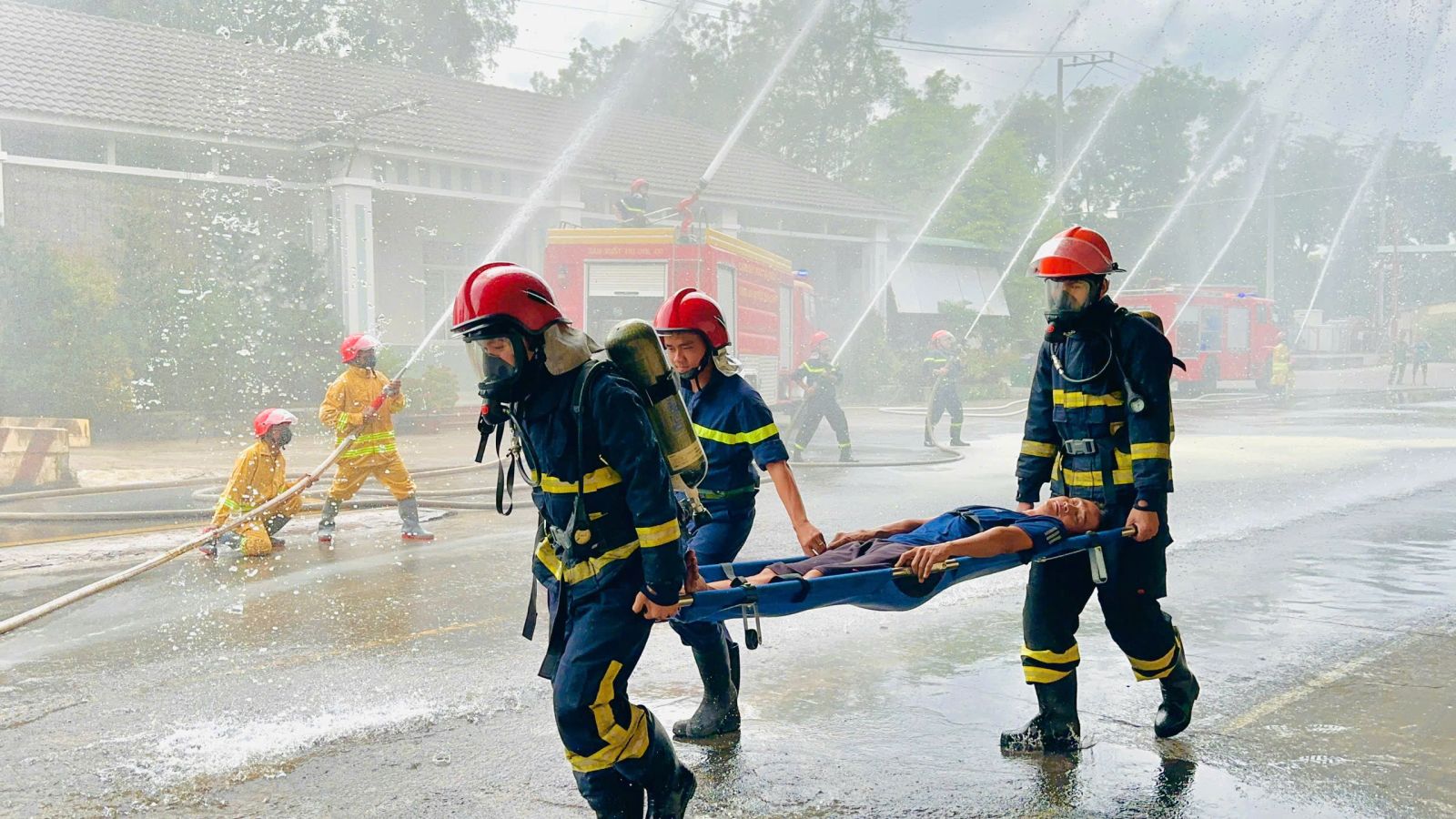 Tình huống giả định, vào lúc 9 giờ, một thiết bị điện trong dây chuyền sản xuất tại nhà máy có hiện tượng quả tải, điện áp trong mạch tăng cao dẫn đến chập gây cháy. Đám cháy nhanh chóng bùng phát dữ dội, bắt đầu cháy lan sang khu vực kho cao su thành phẩm, do phát hiện chậm và cao su cháy với tốc độ lan rất nhanh, sinh ra nhiều khói khí độc.