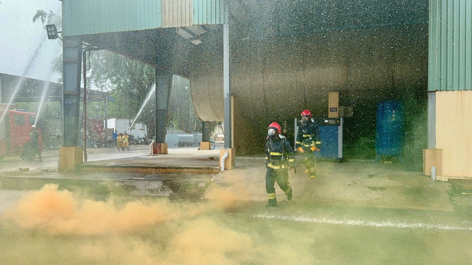 Tình huống giả định: lúc 14 giờ, ngày 28.3.2025, xe tải khi đang lấy hàng tại khu vực kho thuộc nhà xưởng thì mất lái khiến phần trụ của kho bị gãy, một phần mái sụp xuống khiến 2 nhân viên bị mắc kẹt không thoát ra được, sự cố cũng khiến hệ thống dây dẫn điện bị chập gây cháy. Đám cháy với nhiệt lượng lớn, toả ra nhiều khói khí độc và nhanh chóng lan sang các khu vực xung quanh .