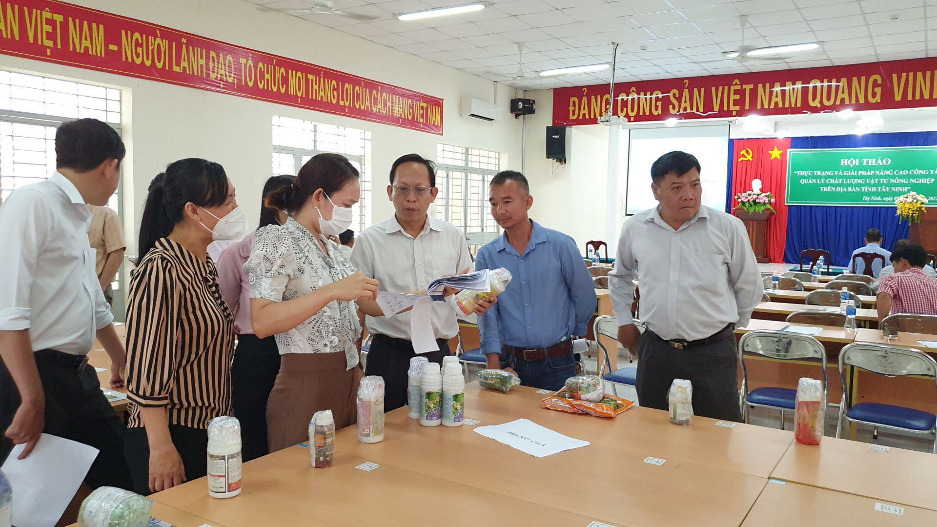 Giám đốc Sở Nông nghiệp và Phát triển nông thôn Nguyễn Đình Xuân và bà Võ Thị Ngoan - Chánh Thanh tra Sở (đứng giữa) cùng các đại biểu kiểm tra các mẫu phân bón, thuốc bảo vệ thực vật giả, kém chất lượng.
