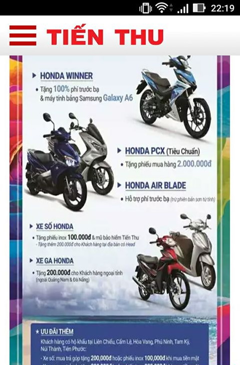 Nắm được tâm lý khách hàng, một đại lý Honda ở Đà Nẵng đã đưa ra chương trình khuyến mại hấp dẫn người tiêu dùng. Cụ thể, đại lý này miễn phí trước bạ và tặng thêm một máy tính bảng Samsung Galaxy A6 cho khách hàng mua xe.