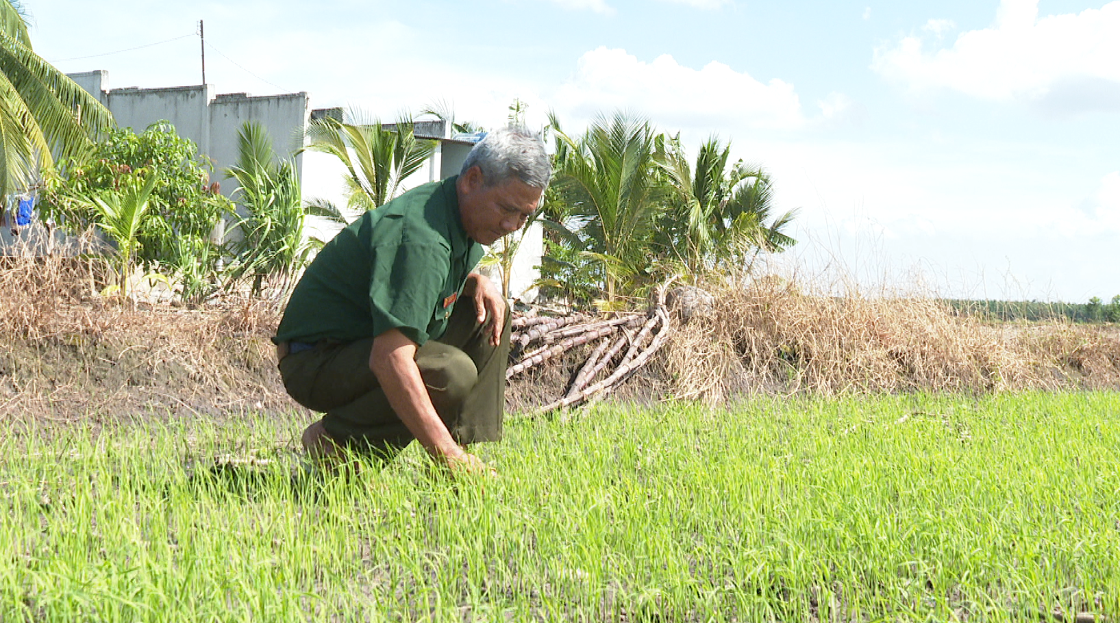 Ông Võ Văn Kiện thăm ruộng lúa của gia đình.