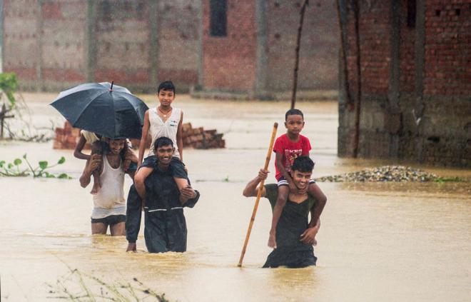 | Một nhóm người Nepal đưa những đứa trẻ qua vùng nước lũ tại làng Ramgadhwa ở Birgunj. Ảnh: AP |