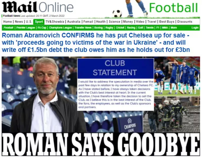 Rạng sáng 3-3, trang chủ Chelsea đăng tải thông báo chính thức của Roman Abramovich về tương lai của đội bóng mà ông nắm quyền sở hữu từ năm 2003. Bên cạnh nội dung quan trọng nhất là tuyên bố chia tay Chelsea, vị tỉ phú người Nga khẳng định sẽ xóa các khoản nợ cho đội bóng; đồng thời sử dụng tiền bán đội bóng để làm quỹ từ thiện giúp đỡ các nạn nhân trong cuộc chiến ở Ukraine. Ông cũng bày tỏ nguyện vọng được tới sân Stamford Bridge lần cuối để nói lời chia tay các thành viên Chelsea.