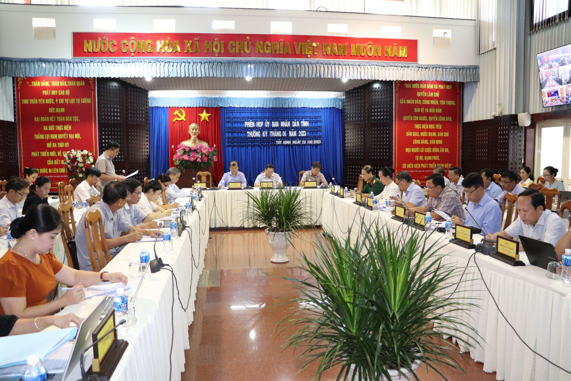 Sáng 22.6, UBND tỉnh tổ chức phiên họp thường kỳ tháng 6 cho ý kiến về tình hình thực hiện kế hoạch phát triển kinh tế - xã hội, đầu tư công, ngân sách nhà nước (NSNN) 6 tháng đầu năm và nhiệm vụ trọng tâm 6 tháng cuối năm 2023. Chủ tịch UBND tỉnh Nguyễn Thanh Ngọc, Phó Chủ tịch Thường trực UBND tỉnh Võ Đức Trong, Phó Chủ tịch Trần Văn Chiến đồng chủ trì phiên họp.