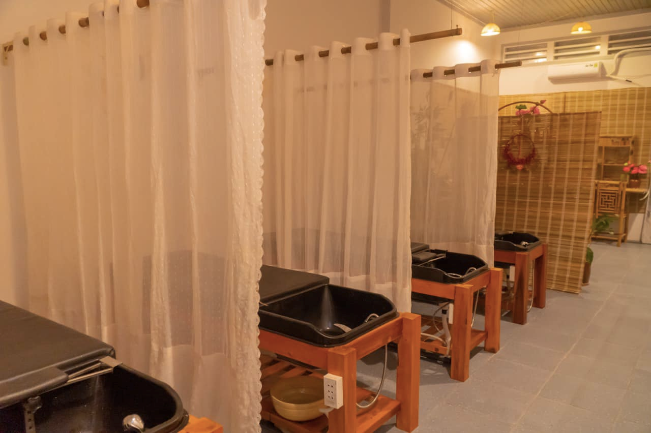 Không gian được thiết kế với phong cách truyền thống Việt Nam, từ những chiếc gối tựa êm ái đến ánh sáng dịu dàng, tạo nên một môi trường thư thái và ấm cúng. Khách hàng có thể thả mình vào không gian này, quên đi những lo toan cuộc sống và tận hưởng khoảnh khắc riêng tư.