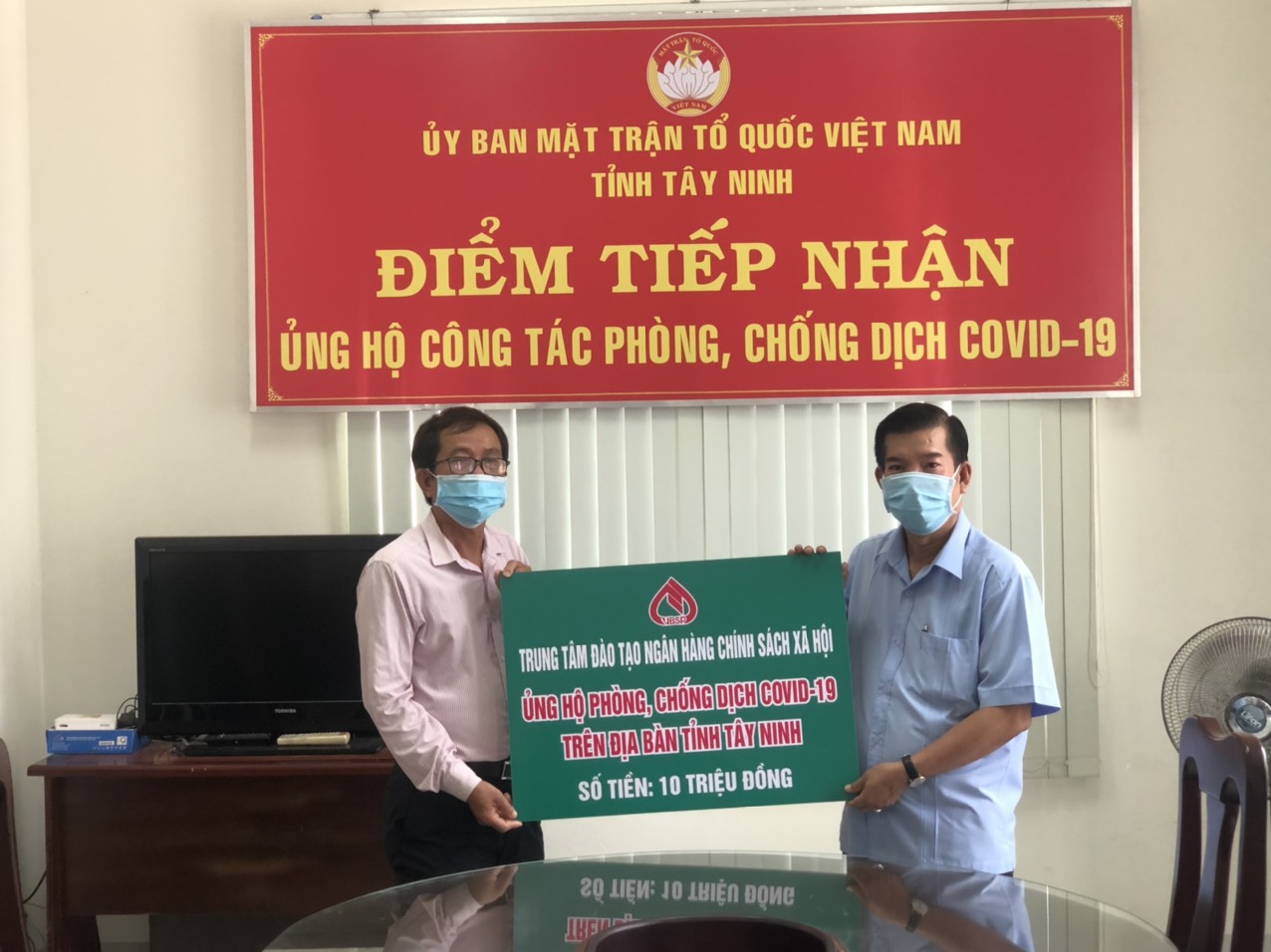 Ông Trang Thái Lâm – Phó Giám đốc Ngân hàng Chính sách Xã hội tỉnh Tây Ninh đại diện, trao bảng ủng hộ của Trung tâm đào tạo Ngân hàng CSXH Việt Nam, Ngân hàng CSXH các tỉnh Điện Biên, Hoà Bình, Bình Thuận và thành phố Hải Phòng, mỗi đơn vị 10 triệu đồng.