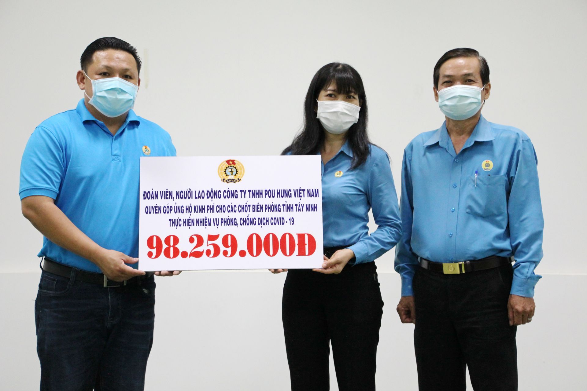 Đoàn đã tiếp nhận số tiền 62.620.000 đồng từ Công ty TNHH Pouli; 228.650.000 đồng từ Công ty TNHH Gain Lucky và 99.259.000 đồng từ Công ty TNHH Pou Hung. Tổng các số tiền trên do ban giám đốc các doanh nghiệp, chuyên gia, công đoàn viên, người lao động đóng góp.