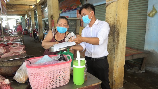 Đoàn kiểm tra tuyên truyền, nhắc nhở tiểu thương chợ Long Vĩnh về công tác phòng chống dịch Covid-19.