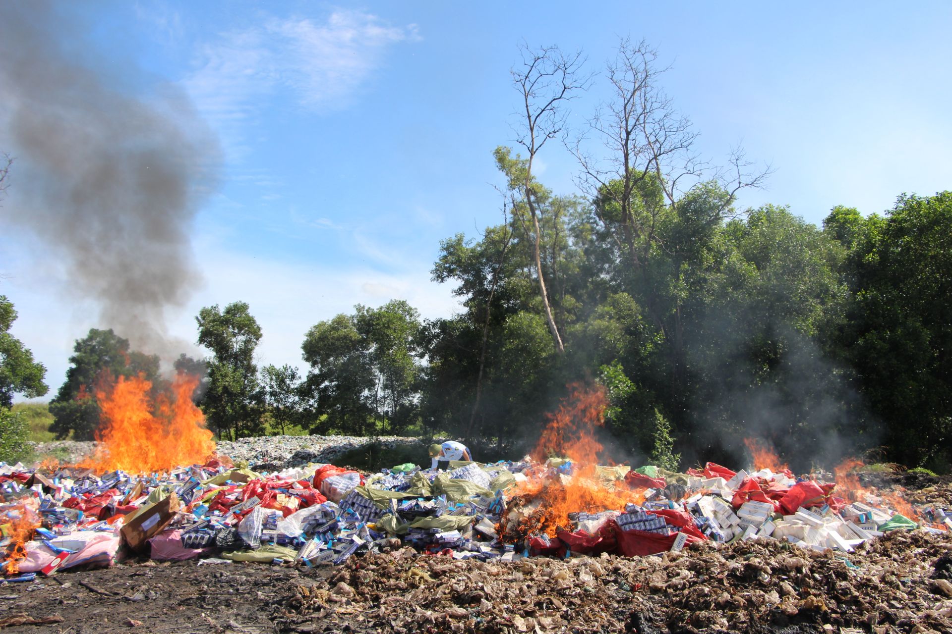 Số thuốc lá nhập lậu, thuốc lá giả bị tiêu huỷ bằng phương pháp đốt.