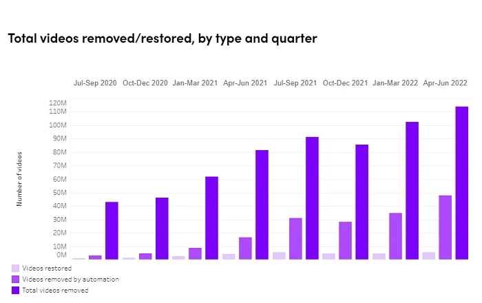 Cũng trong quý II, 48 triệu video đã bị hệ thống tự động của TikTok gỡ bỏ, tăng cao so với các quý trước. Nhưng đa số nội dung bị gỡ là vì người dùng báo cáo lên nền tảng, chiếm 96%. TikTok cho biết hãng đã kết hợp các công cụ tự động và đánh giá của người dùng để nhận diện những nội dung vi phạm quy định.