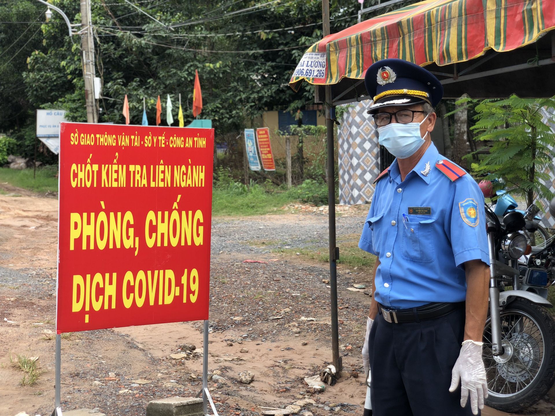 Ông Nguyễn Văn Thiên- Thanh Tra Giao thông vận tải thực hiện nhiệm vụ tại chốt kiểm soát dịch trên địa bàn xã Hưng Thuận.