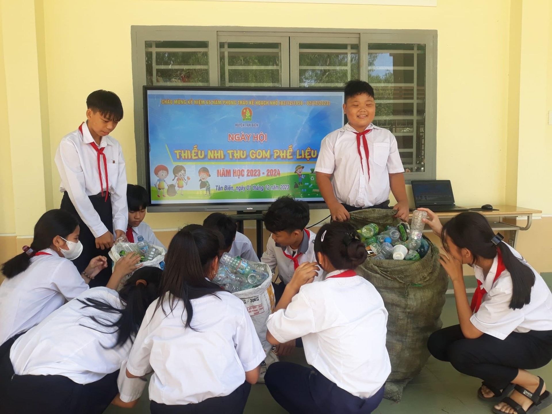Đội viên, thiếu nhi huyện Tân Biên tham gia góp chai nhựa làm Kế hoạch nhỏ.