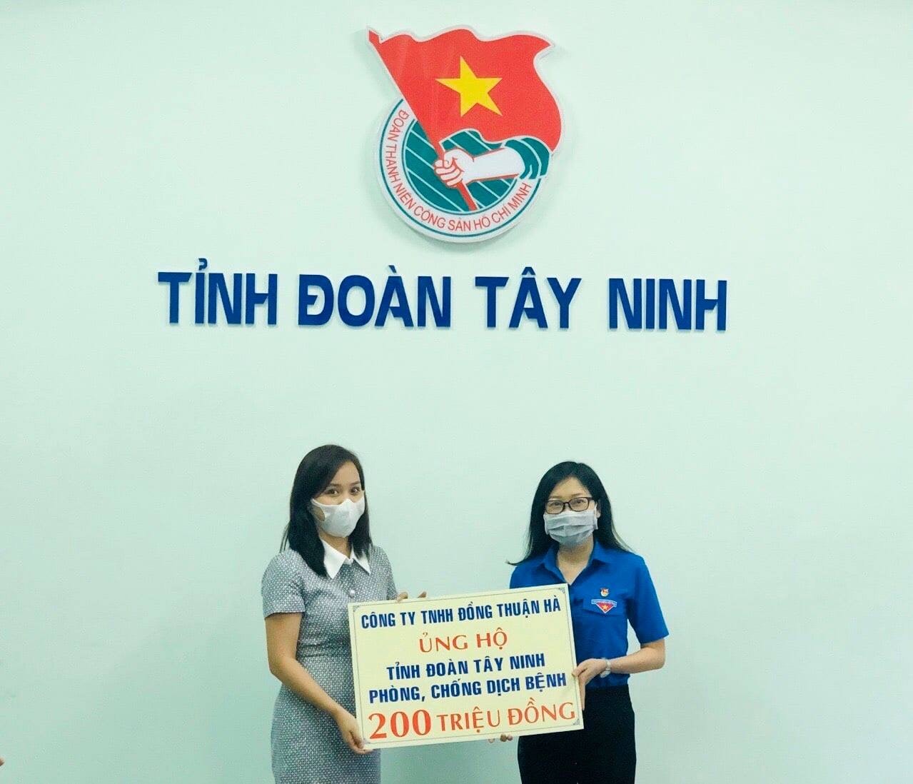 Chiều 23.3, Tỉnh Đoàn Tây Ninh tiếp nhận số tiền 200 triệu đồng từ Công ty TNHH Đồng Thuận Hà (phường 3, thành phố Tây Ninh) hỗ trợ thực hiện các hoạt động phòng chống dịch Covid-19 của tuổi trẻ tỉnh nhà.