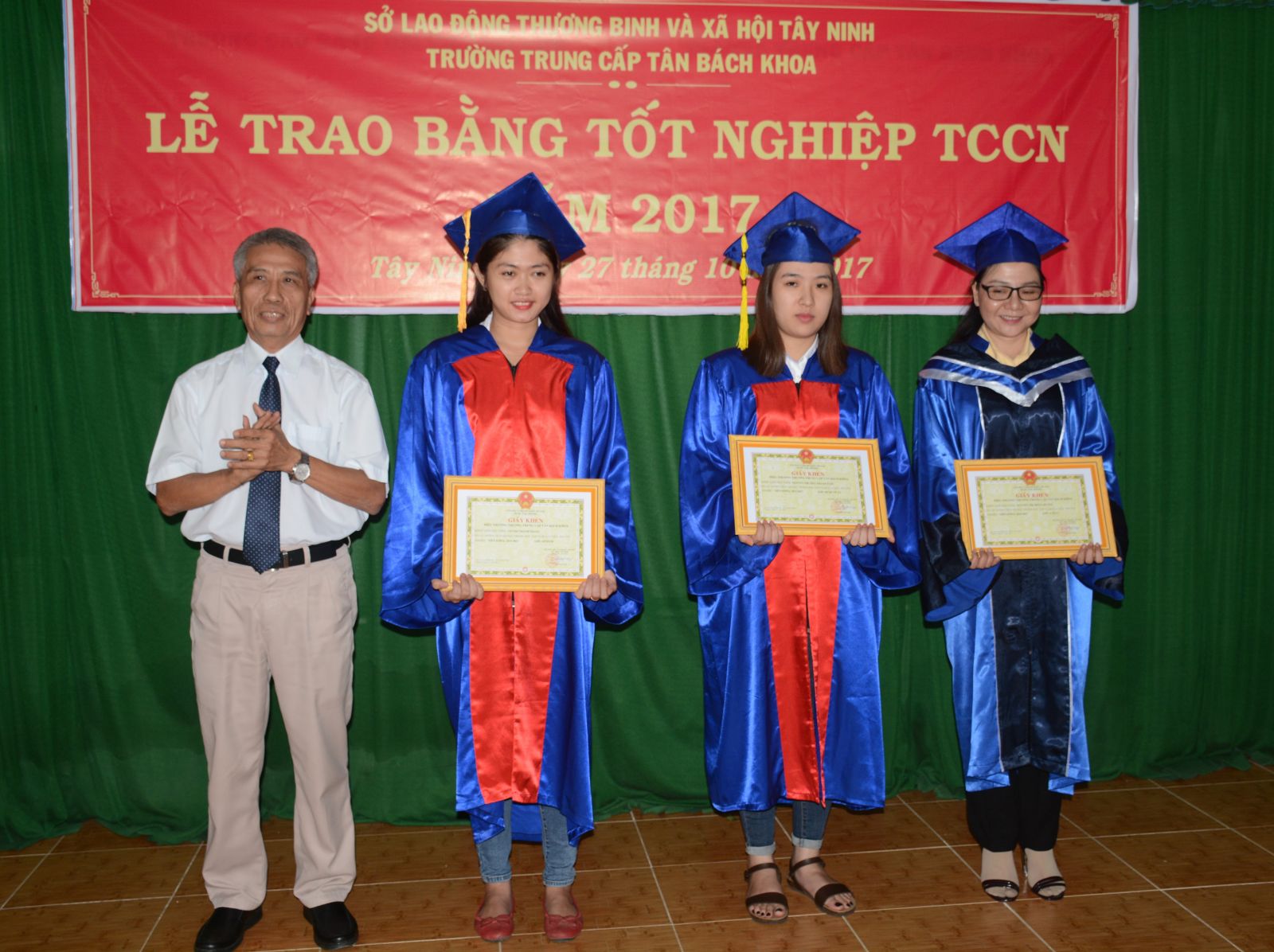 Ông Nguyễn Văn Quá, Phó Giám đốc Sở LÐ-TB&XH trao bằng tốt nghiệp cho học viên Trường trung cấp Tân Bách Khoa.
