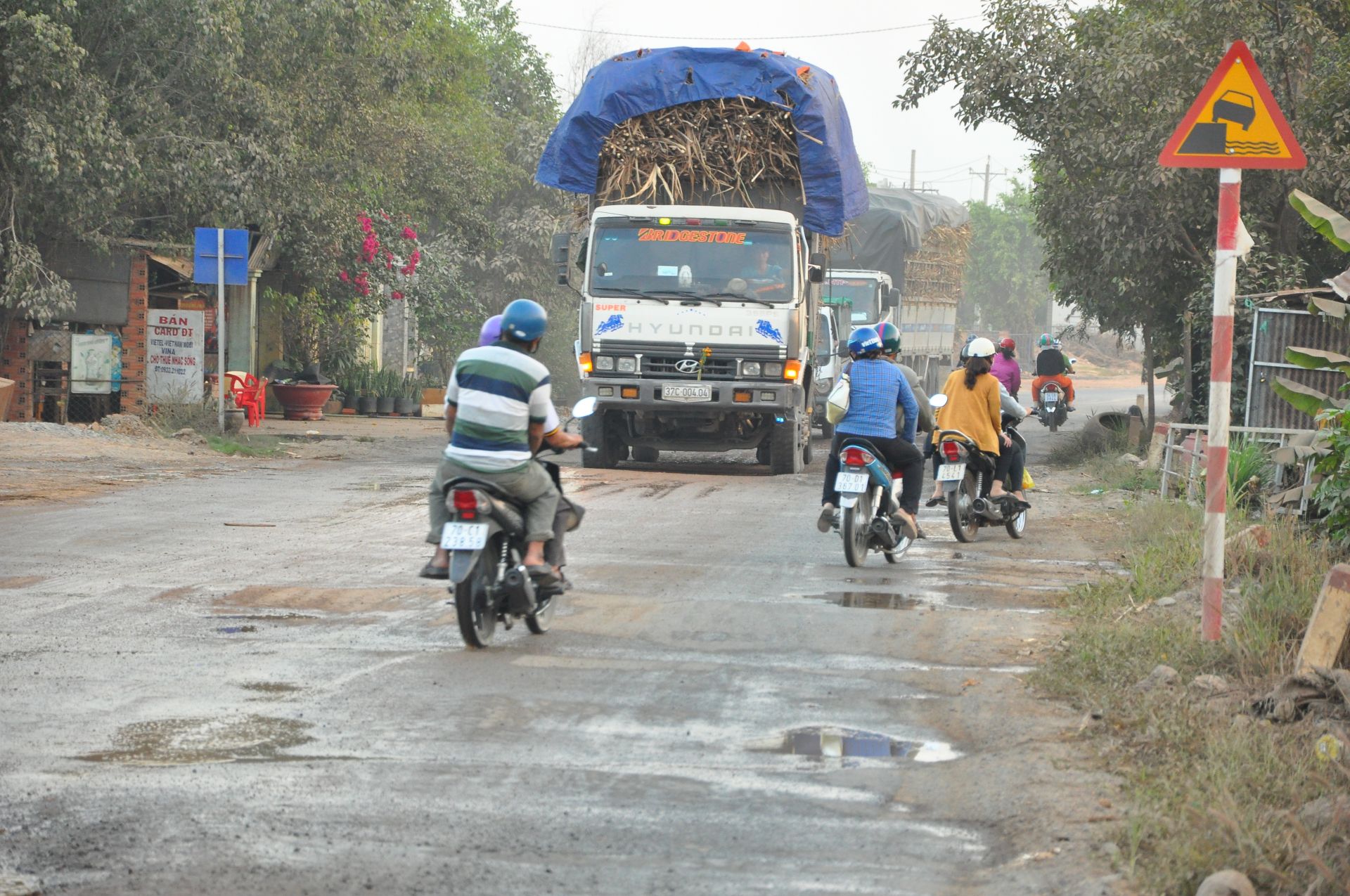 Các phương tiện đi từ hướng cầu Gò Chai về TP.Tây Ninh phải lấn sang bên trái vì ổ gà khá lớn và sâu.