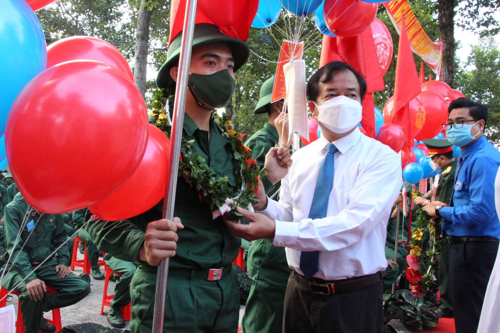 Trưởng Ban Nội chính Tỉnh uỷ Nguyễn Hồng Thanh tặng hoa, động viên cho các tân binh.