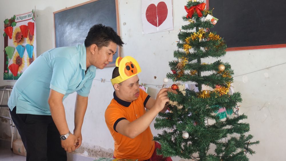 Hướng dẫn các em trang trí cây thông giáng sinh.