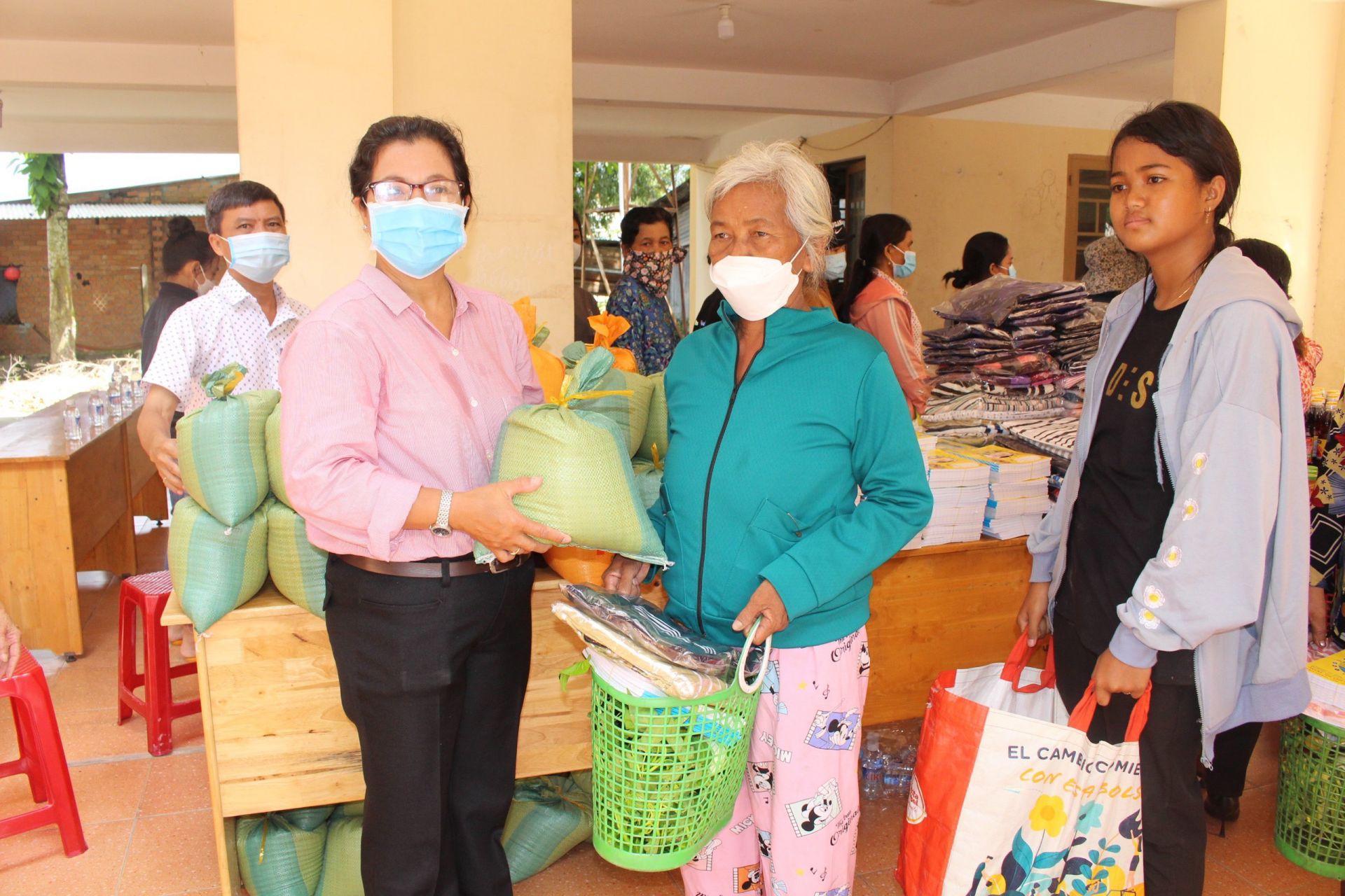 Trao quà cho hội viên, phụ nữ dân tộc Khmer thông qua “Phiên chợ 0 đồng”.