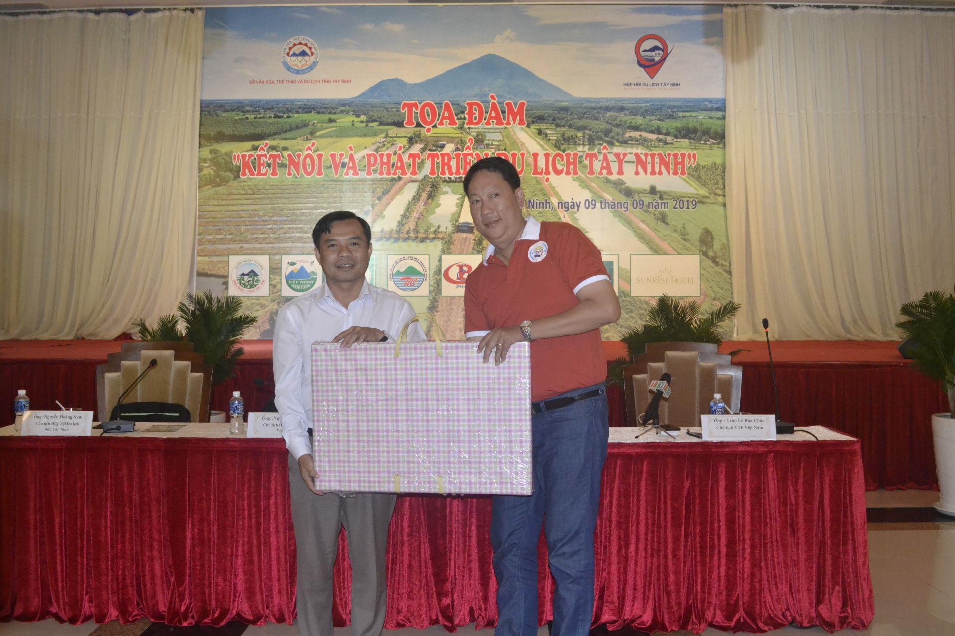 Ông Trần Lê Bảo Châu- Chủ tịch VTF Việt Nam trao quà cảm ơn cho ông Nguyễn Hoàng Nam- Chủ tịch Hiệp hội Du lịch Tây Ninh.