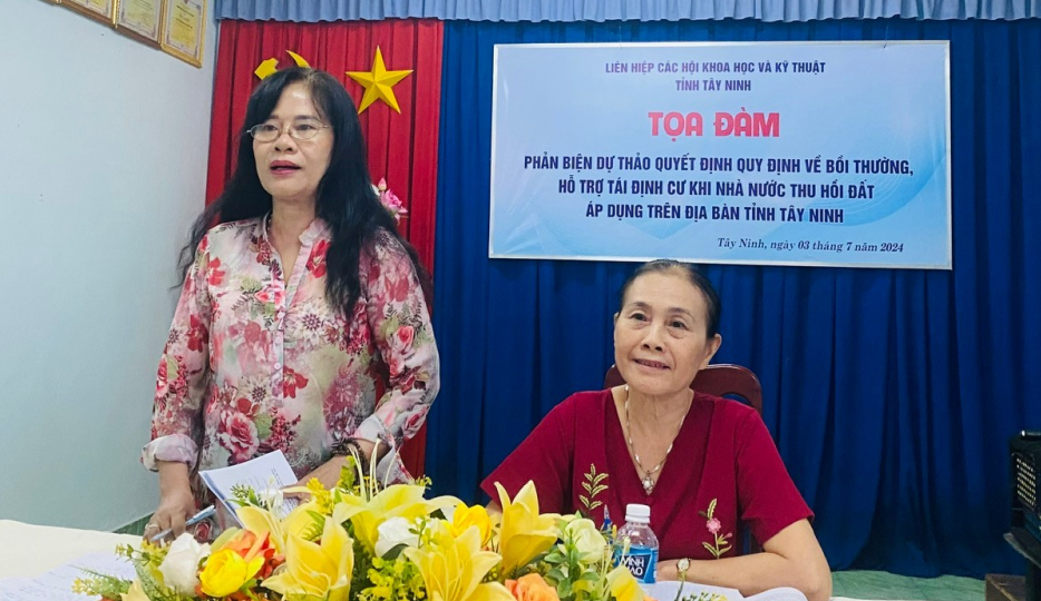 Mới đây, bà Dương Thị Thu Hiền- Chủ tịch Liên hiệp các Hội Khoa học và Kỹ thuật Tây Ninh chủ trì buổi toạ đàm đóng góp ý kiến phản biện dự thảo Quy định về bồi thường, hỗ trợ tái định cư khi Nhà nước thu hồi đất, áp dụng trên địa bàn tỉnh Tây Ninh.