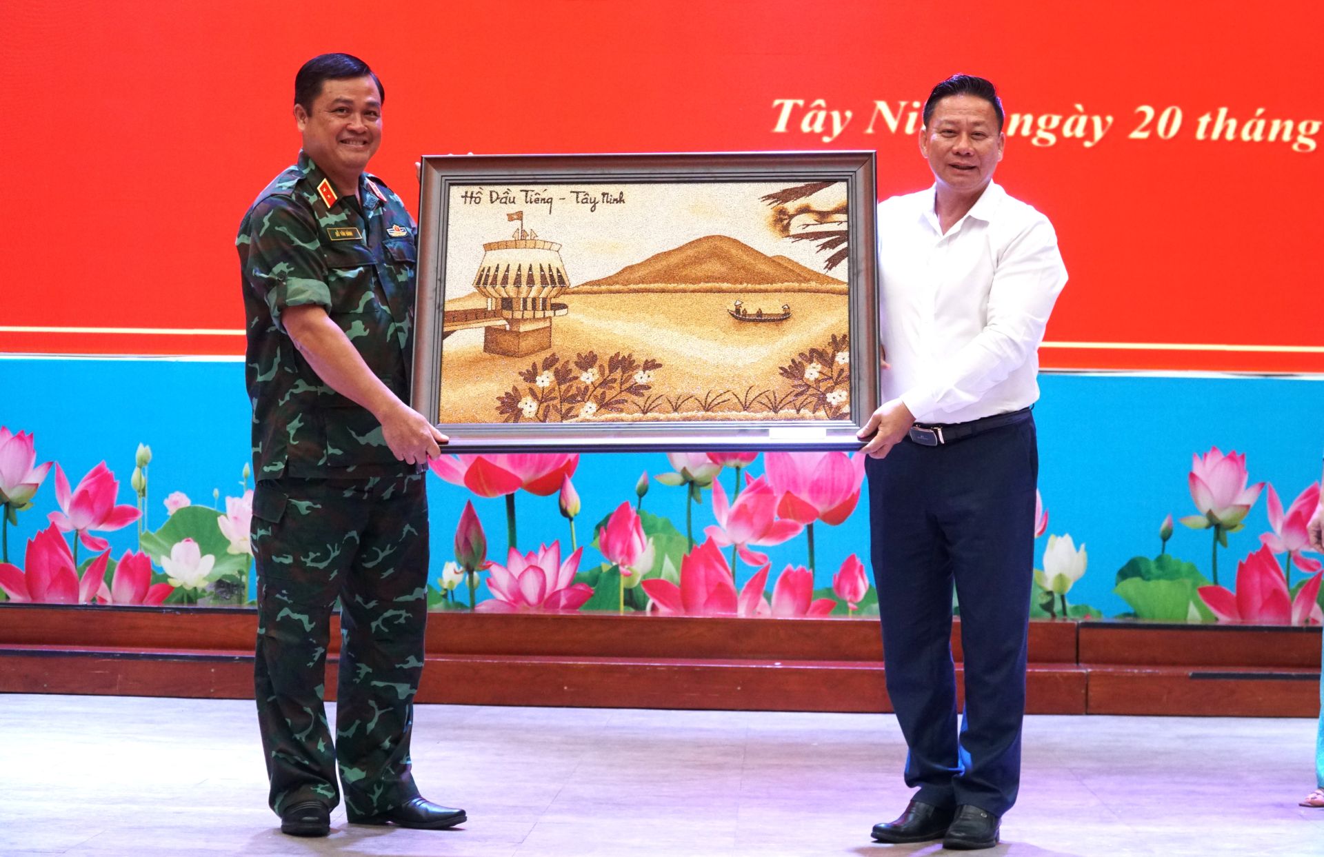 Lãnh đạo tỉnh Tây Ninh tặng quà lưu niệm cho lãnh đạo Học viện Quốc phòng.