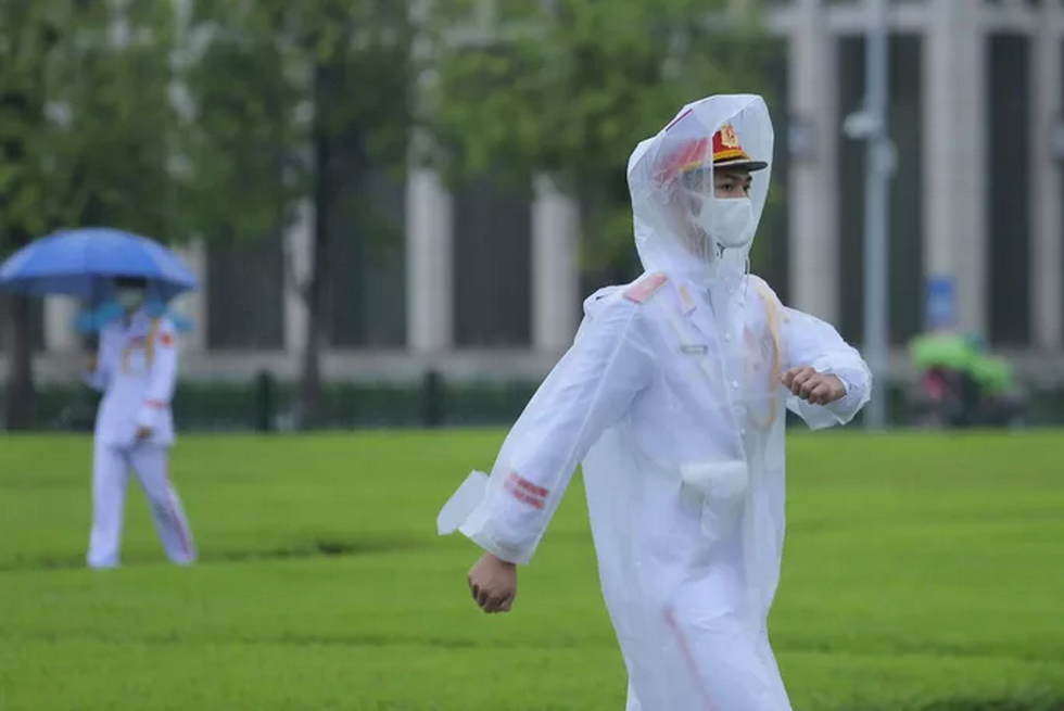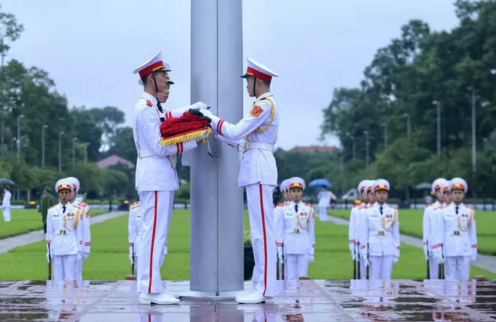 Theo ghi nhận của Báo Người Lao Động, lúc 6 giờ sáng ngày 14-8, thời tiết Hà Nội có mưa, nhiều người dân tới chứng kiến Lễ treo cờ rủ dưới mưa.