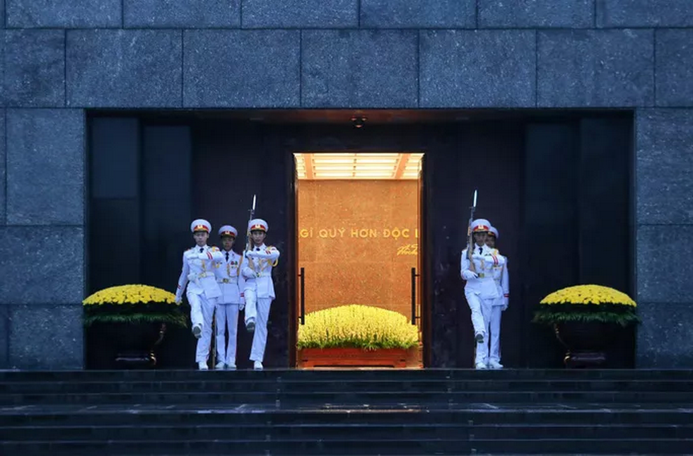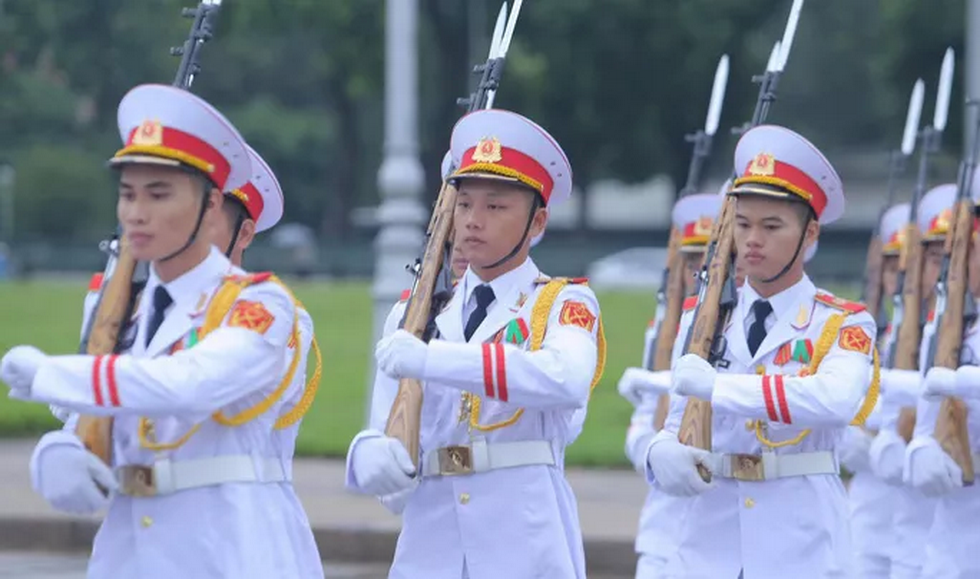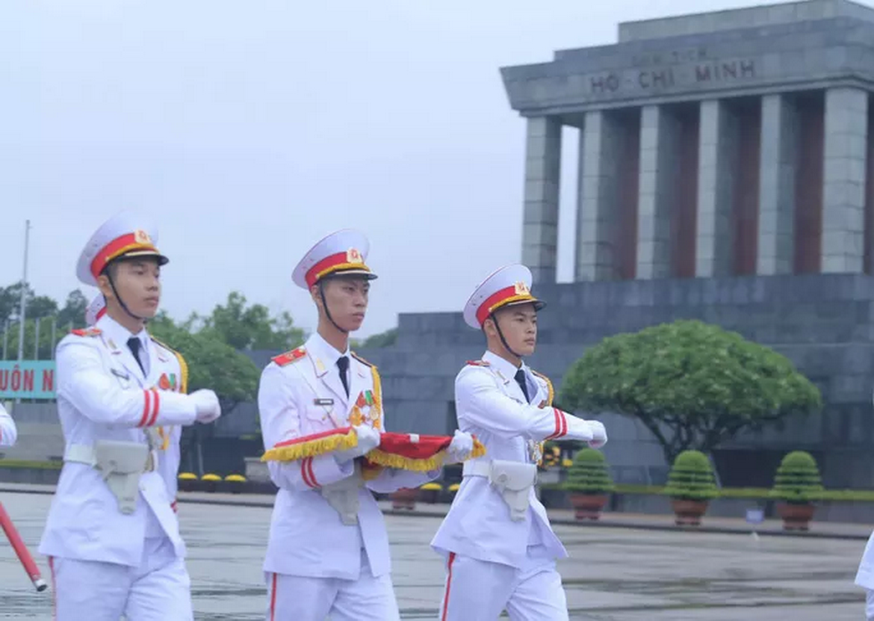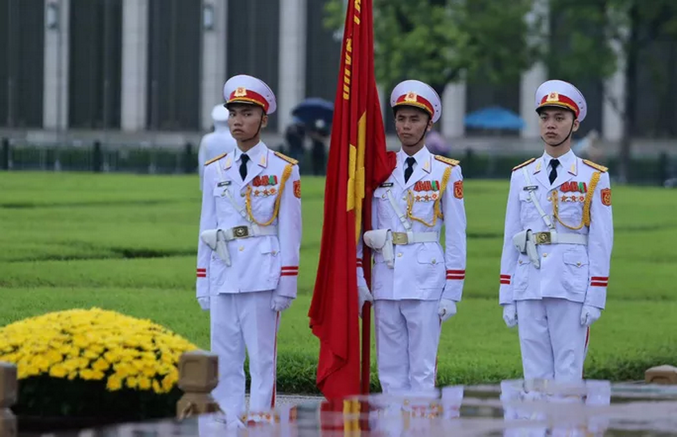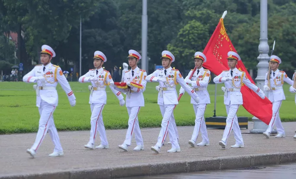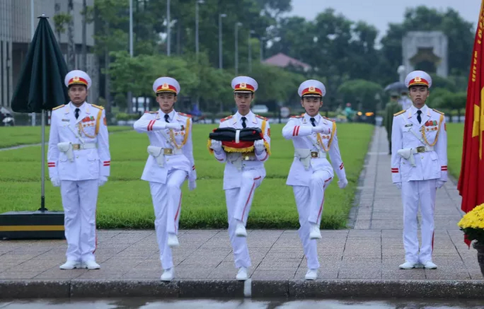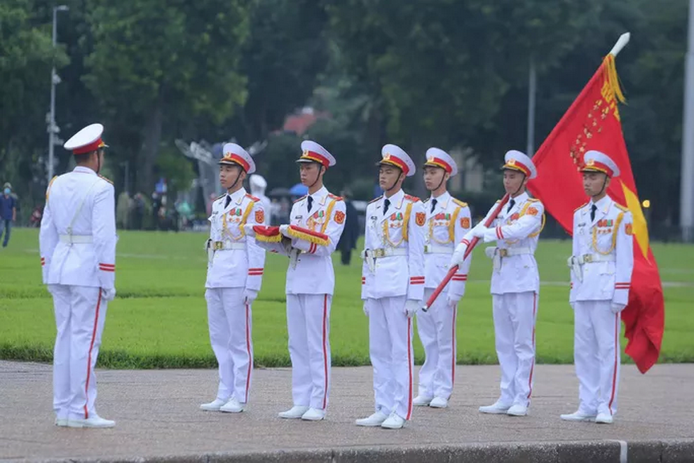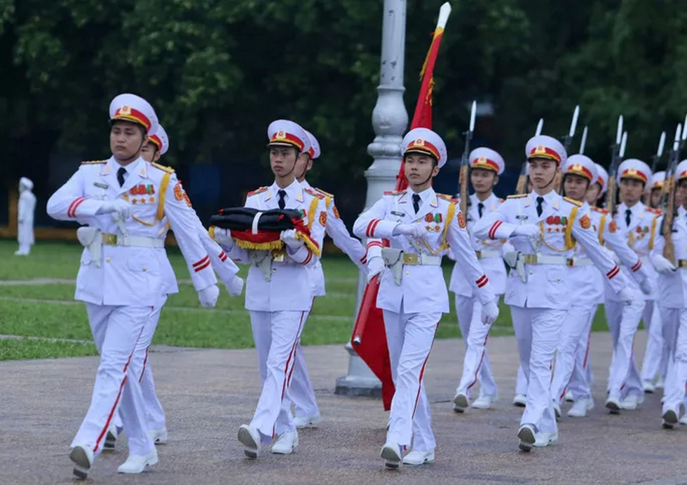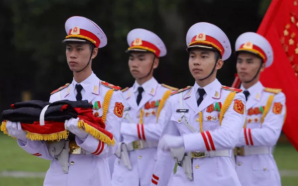 Đội tiêu binh Bộ Tư lệnh bảo vệ Lăng Chủ tịch Hồ Chí Minh mang theo lá cờ được gắn dải băng tang.