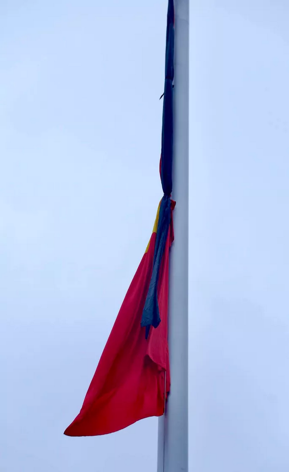 Lá cờ rủ với dải băng tang đã được treo lên cột.
