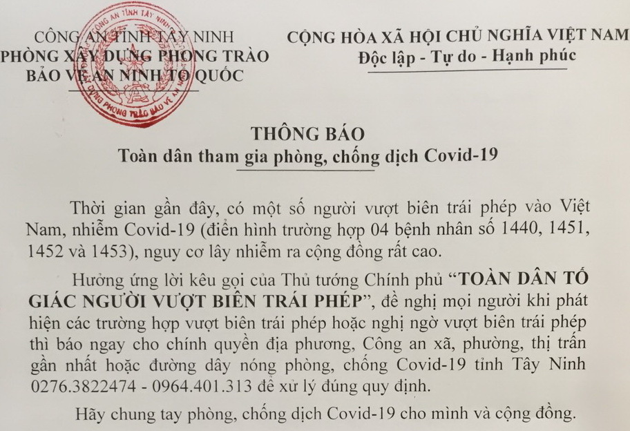 Hưởng ứng lời kêu gọi của Thủ tướng Chính phủ “Toàn dân tố giác người vượt biên trái phép”, đề nghị mọi người khi phát hiện các trường hợp vượt biên trái phép hoặc nghi ngờ vượt biên trái phép thì báo ngay cho chính quyền địa phương, Công an xã, phường, thị trấn gần nhất hoặc đường dây nóng phòng, chống Covid-19 tỉnh Tây Ninh 0276.3822474 - 0964.401.313 để xử lý đúng quy định.