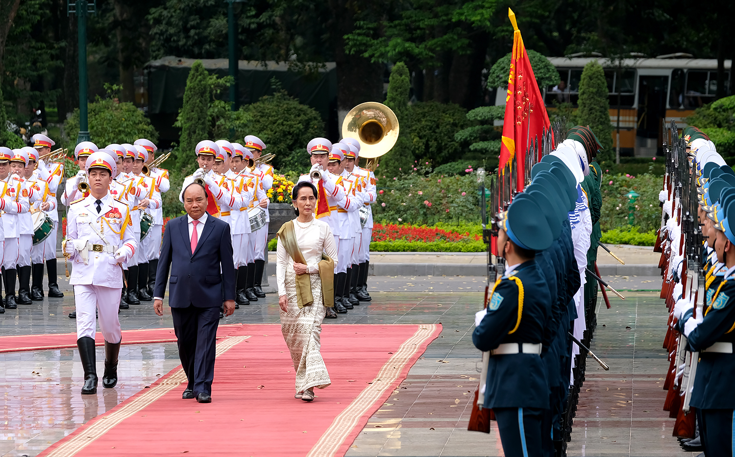 Thủ tướng Nguyễn Xuân Phúc và Cố vấn Nhà nước Myanmar Aung San Suu Kyi trong lễ đón. Ảnh: VGP/Quang Hiếu