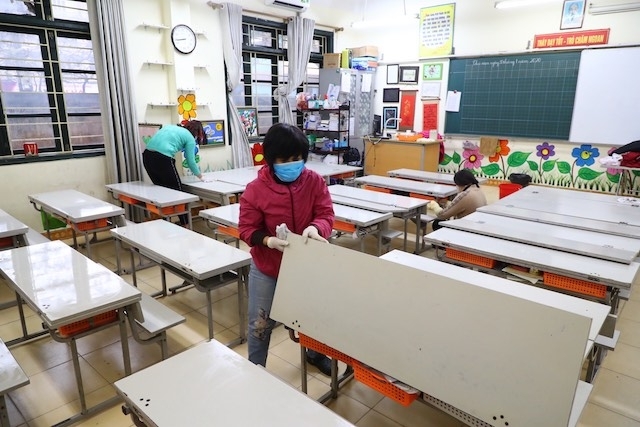Thực hiện lau, khử khuẩn tại Trường tiểu học Nghĩa Tân, Cầu Giấy, Hà Nội, Việt Nam. (Ảnh: ĐĂNG ANH)