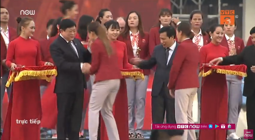 Bộ trưởng Bộ VHTT&DL Nguyễn Ngọc Thiện, Tổng Giám đốc Đài Tiếng nói Việt Nam Nguyễn Thế Kỷ chào mừng HLV Park Hang-seo và các cầu thủ Olympic Việt Nam thắng lợi trở về.