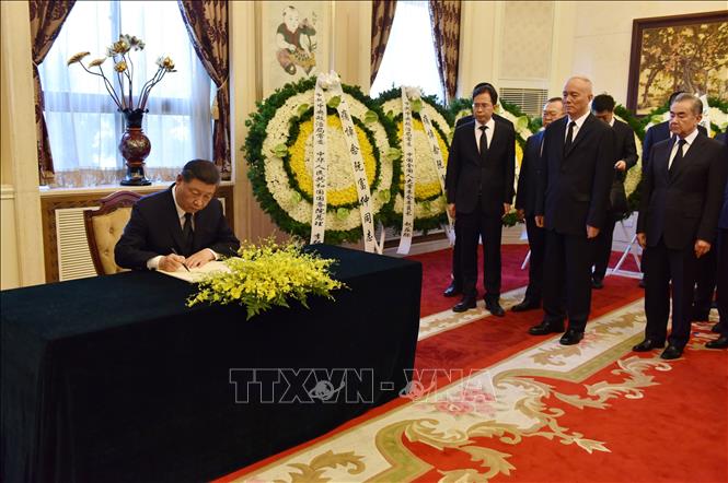 Tổng Bí thư, Chủ tịch Trung Quốc Tập Cận Bình ghi sổ tang tại Lễ viếng Tổng Bí thư Nguyễn Phú Trọng. Ảnh: Thành Dương/PV TTXVN tại Trung Quốc