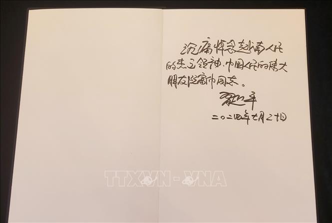 Tổng Bí thư, Chủ tịch Trung Quốc Tập Cận Bình ghi dòng chữ trong Sổ tang: "Vô cùng thương tiếc đồng chí Nguyễn Phú Trọng, lãnh tụ kiệt xuất của nhân dân Việt Nam, người bạn vĩ đại của nhân dân Trung Quốc". Ảnh: Thành Dương/PV TTXVN tại Trung Quốc