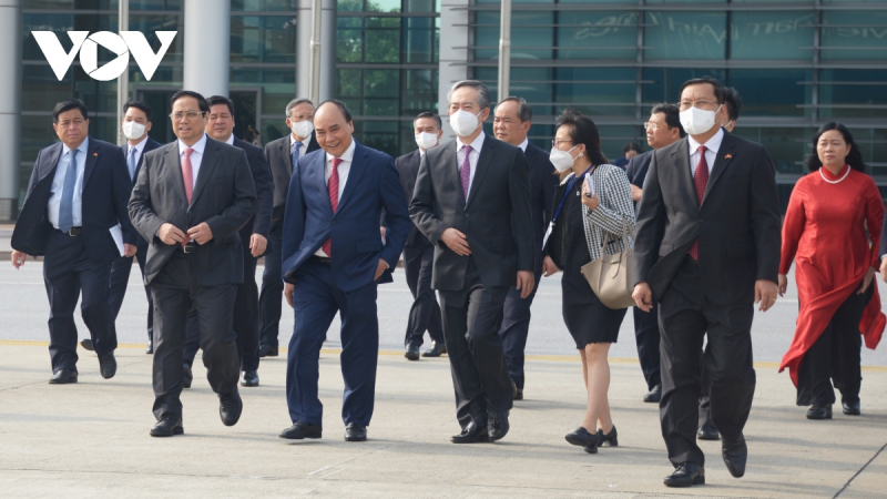 Chủ tịch nước Nguyễn Xuân Phúc, Thủ tướng Chính phủ Phạm Minh Chính và các đồng chí lãnh đạo Đảng, Nhà nước ra sân bay tiễn Tổng Bí thư Nguyễn Phú Trọng và Đoàn.