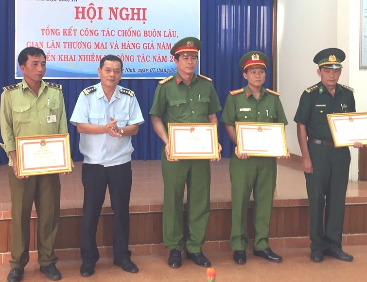 Dịp này, UBND tỉnh Tây Ninh đã tặng bằng khen cho 5 tập thể và 5 cá nhân; Ban Chỉ đạo 389 tỉnh khen thưởng 14 tập thể, 14 cá nhân có thành tích xuất sắc trong công tác chống buôn lậu, gian lận thương mại và hàng giả năm 2016.