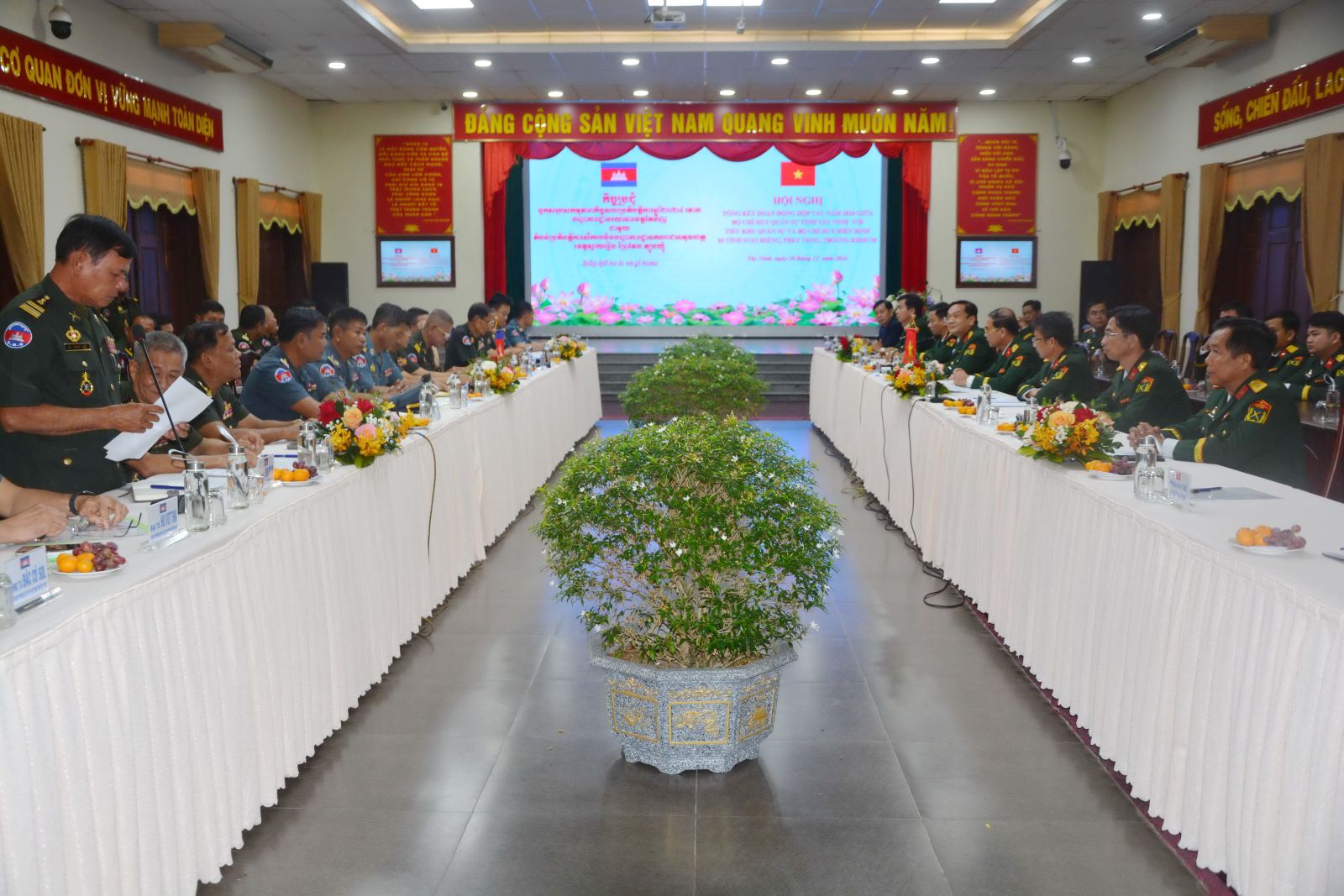 Phát biểu chào mừng, Đại tá Ngô Thành Đồng- Chỉ huy trưởng Bộ CHQS tỉnh chúc mừng các đơn vị hợp tác, kết nghĩa thuộc Quân đội Hoàng gia Campuchia sang thăm và dự hội nghị, góp phần khẳng định mới quan hệ truyền thống đoàn kết hữu nghị gắn bó giữa hai nước láng giềng.