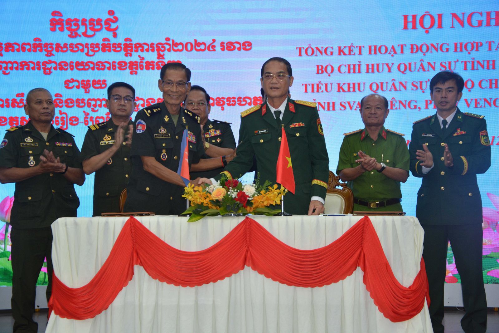 Ngày 20.12, Bộ Chỉ huy Quân sự (CHQS) tỉnh Tây Ninh, đoàn đại biểu Tiểu khu Quân sự cùng Bộ Chỉ huy Hiến binh 3 tỉnh Svay Rieng, Prey Veng, Tbong Khmum tham dự hội nghị tổng kết hoạt động hợp tác năm 2024, ký kết biên bản hợp tác năm 2025 giữa Bộ CHQS tỉnh với các đơn vị hợp tác, kết nghĩa thuộc Quân đội Hoàng gia Campuchia.