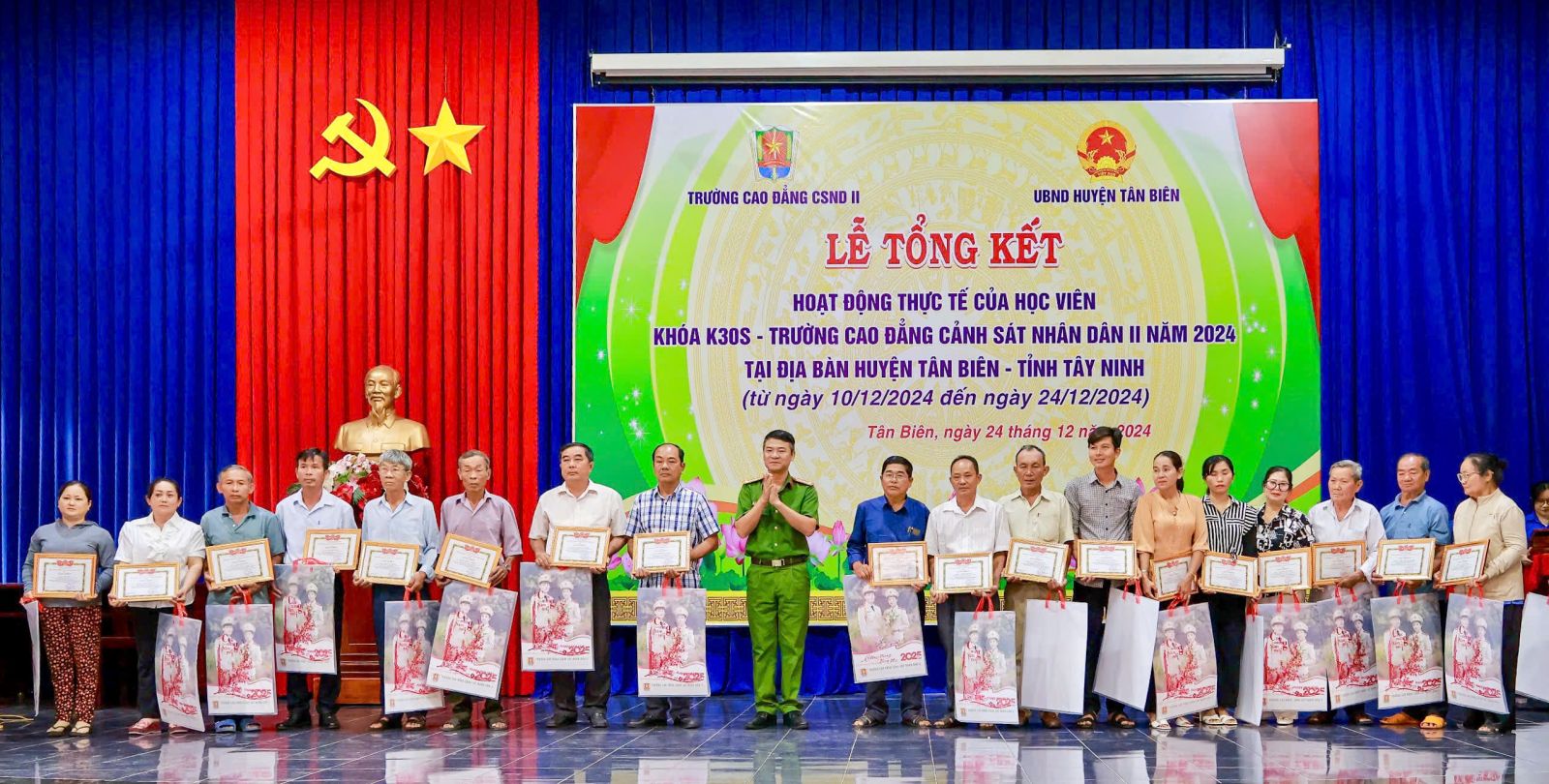 Dịp này, Trường Cao đẳng Cảnh sát Nhân dân II trao giấy khen và quà cho các hộ gia đình nuôi quân; Công an tỉnh, UBND huyện Tân Biên và Huyện đoàn cũng khen thưởng các học viên có thành tích xuất sắc trong đợt sinh hoạt chính trị - xã hội trên địa bàn huyện.