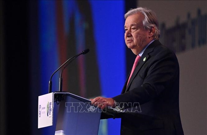 Tổng Thư ký LHQ António Guterres phát biểu tại phiên khai mạc Hội nghị thượng đỉnh các nhà lãnh đạo thế giới trong khuôn khổ Hội nghị COP26 ở Glasgow, Scotland, Anh. Ảnh tư liệu: AFP/TTXVN