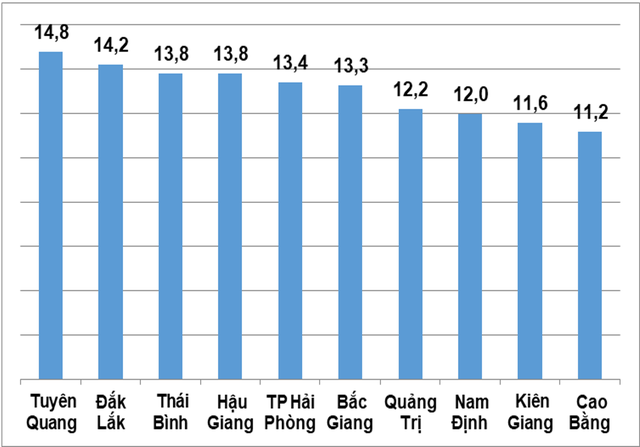 10 địa phương có chỉ số IIP giảm nhiều nhất 4 tháng đầu năm (%). Nguồn: GSO