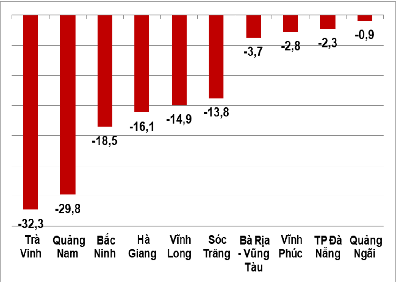 Ở chiều ngược lại, Trà Vinh ghi nhận tốc độ giảm IIP lớn nhất trong 4 tháng đầu năm, giảm khoảng 32,3% so với cùng kỳ năm 2021. Theo là Quảng Nam với tốc độ giảm 29,8% so với cùng kỳ năm trước. Tiếp theo là Bắc Ninh; Hà Giang; Vĩnh Long; Sóc Trăng; Bà Rịa - Vũng Tàu... với tốc độ giảm lần lượt là 18,5%; 16,1%; 14,9%; 13,8% và 3,7%.