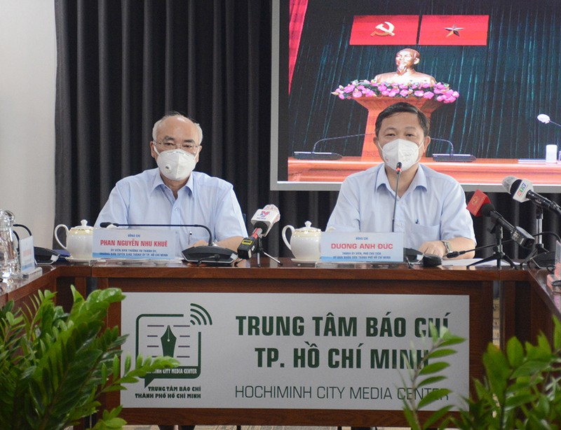 Phó Chủ tịch UBND TP.HCM Dương Anh Đức và ông Phan Nguyễn Như Khuê, Trưởng Ban Tuyên giáo, tại buổi họp báo. Ảnh: H.LAN