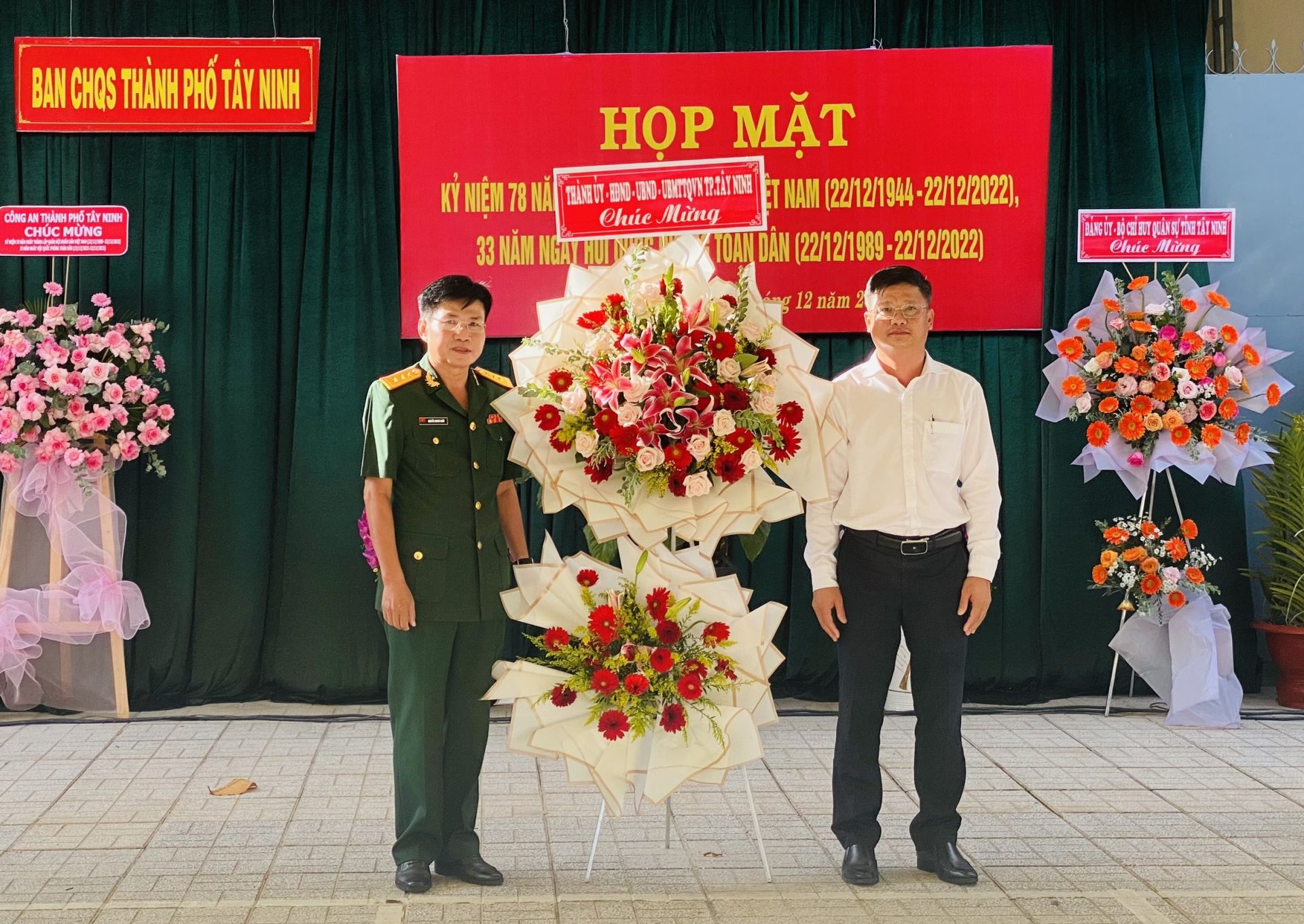 Ông Lê Minh Thế – Ủy viên Ban Thường vụ tỉnh ủy, Bí thư Thành ủy Tây Ninh trao tặng lẵng hoa cho Thượng Tá Nguyễn Quang Nhất – Chính trị viên Ban CHQS thành phố tại buổi họp mặt.