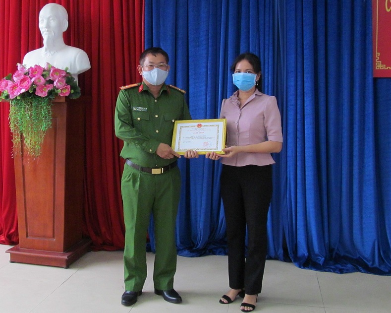 Bà Nguyễn Thị Hoàng Oanh- Phó Chủ tịch UBND TP.Tây Ninh trao giấy khen cho lãnh đạo Công an Thành phố.